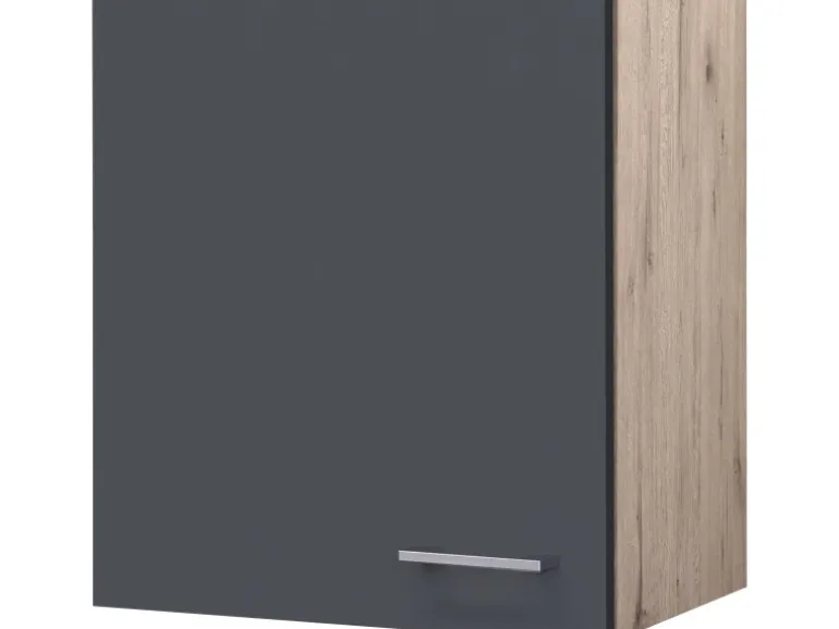 Der 50 cm breite Oberschrank mit einer Drehtür verfügt über einen Einlegeboden und weiß durch eine hochwertige Verarbeitung sowie Materialauswahl zu gefallen und garantiert Ihnen auch auf kleinen Flächen ein Höchstmaß an Stauraum.