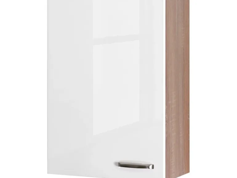 Der Oberschrank Valero überzeugt durch eine geradlinige Formgebung und zeichnet sich durch ein helles und freundliches Ambiente aus. Dabei bietet Ihnen der hochwertige Hängeschrank ein reizvolles Dekor in der Farbe Hochglanz Weiß kombiniert mit Sonoma Eiche und eignet sich optimal als passende Ergänzung zur Küchenserie Valero .