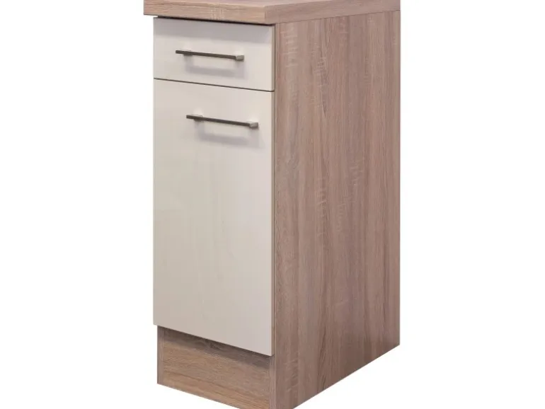 Der Unterschrank Orlando überzeugt durch eine geradlinige Formgebung und zeichnet sich durch ein helles und freundliches Ambiente aus. Dabei bietet Ihnen der hochwertige Unterschrank ein reizvolles Dekor in der Farbe Kaschmir Glanz kombiniert mit Sonoma Eiche und eignet sich optimal als passende Ergänzung zur Küchenserie Orlando.