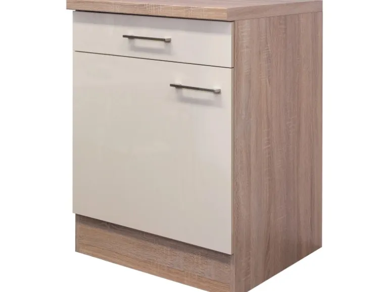Der Unterschrank Orlando überzeugt durch eine geradlinige Formgebung und zeichnet sich durch ein helles und freundliches Ambiente aus. Dabei bietet Ihnen der hochwertige Unterschrank ein reizvolles Dekor in der Farbe Kaschmir Glanz kombiniert mit Sonoma Eiche und eignet sich optimal als passende Ergänzung zur Küchenserie Orlando.