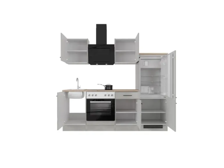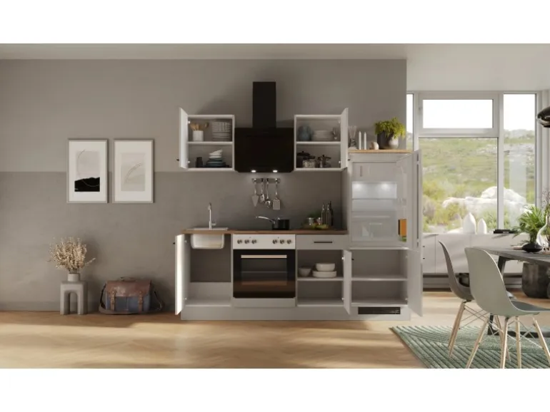 Ob erste Wohnung, Single-Haushalt, Ferienwohnung oder im Büro – diese kleinen Küchen von 220 cm Breite überzeugen durch ihr Design und die vielfältigen Funktionen. Die Türen der Schränke sind sowohl für den links- als auch rechtsseitigen Aufbau vorbereitet, was Ihnen ein Höchstmaß an Flexibilität bei der Montage bietet. Die hochwertigen und pflegeleichten Kunststofffronten und die stabile Bauweise der Schrankkörper garantieren Ihnen lange Freude an Ihrer Küche. Trotz kleiner Maße viel Stauraum