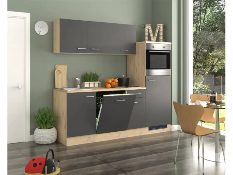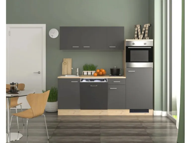 Ein Highlight der Küchenzeile ist der hochgebaute Backofen, der auf angenehmer Höhe das Backen ermöglicht. Zum Kochen steht Ihnen eine praktische Kochmulde mit zwei Kochfeldern zur Verfügung. Der kleine, aber praktische Einbaukühlschrank verfügt über ein Gefrierfach. Ein vollintegrierter Geschirrspüler und eine Single-Einbauspüle aus Edelstahl runden diese durchdachte Küchenzeile ab.