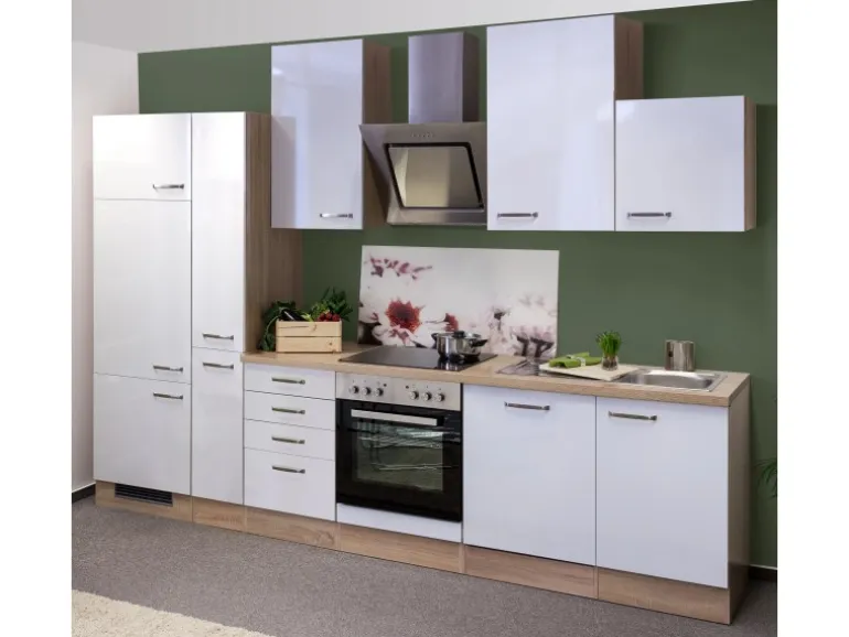 Die 310 cm breite Küchenzeile besteht aus (BxHxT):