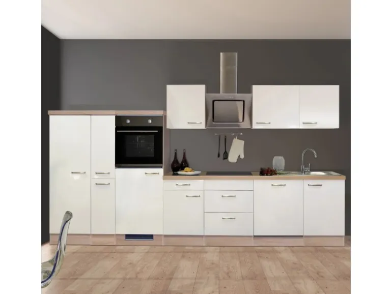 Diese moderne Küche mit einer Gesamtbreite von 360 cm ist ideal für Familien und ambitionierte Hobbyköche und bietet neben der hohen Funktionalität viel Stauraum für Geräte und Vorräte. Die Türen der Schränke sind sowohl für den links- als auch rechtsseitigen Aufbau vorbereitet, was Ihnen ein Höchstmaß an Flexibilität bei der Montage bietet. Die 140 cm breite Demischrank-Einheit aus Geschirr-, Apotheker- und Geräteschrank lässt sich individuell stellen und passt sich so den unterschiedlichen räumlichen Gegebenheiten perfekt an. Die hochwertigen und pflegeleichten Kunststofffronten und die stabile Bauweise der Schrankkörper garantieren Ihnen lange Freude an Ihrer Küche. Eine gut verständliche Aufbauanleitung sowie sämtliche Beschläge liegen selbstverständlich dabei.
