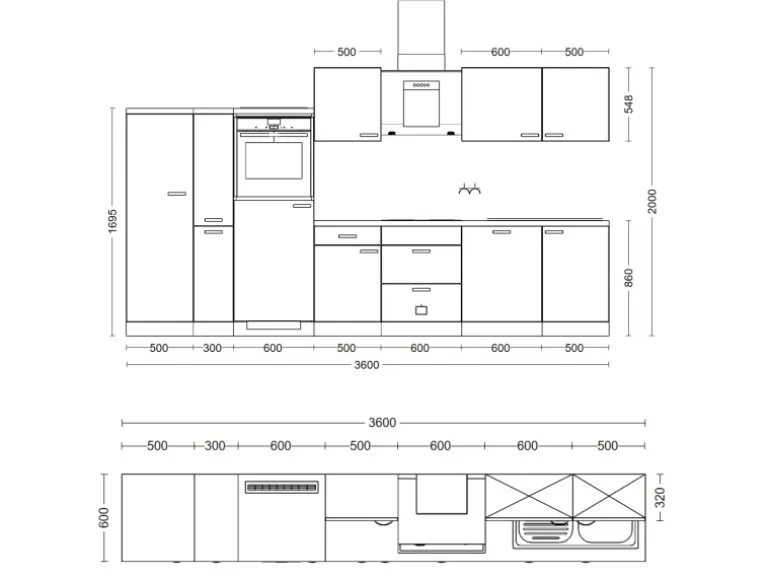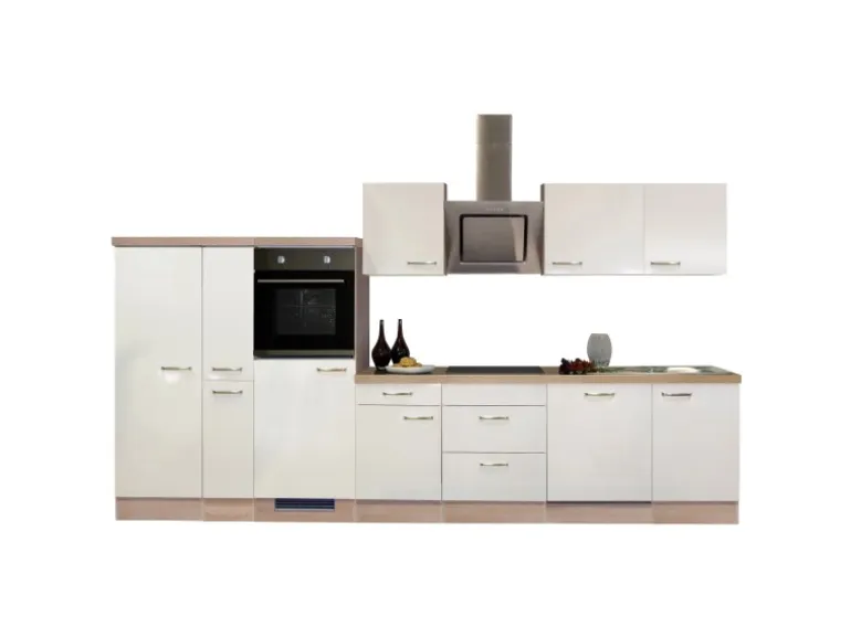 Die 360 cm breite Küchenzeile besteht aus (B x H x T):