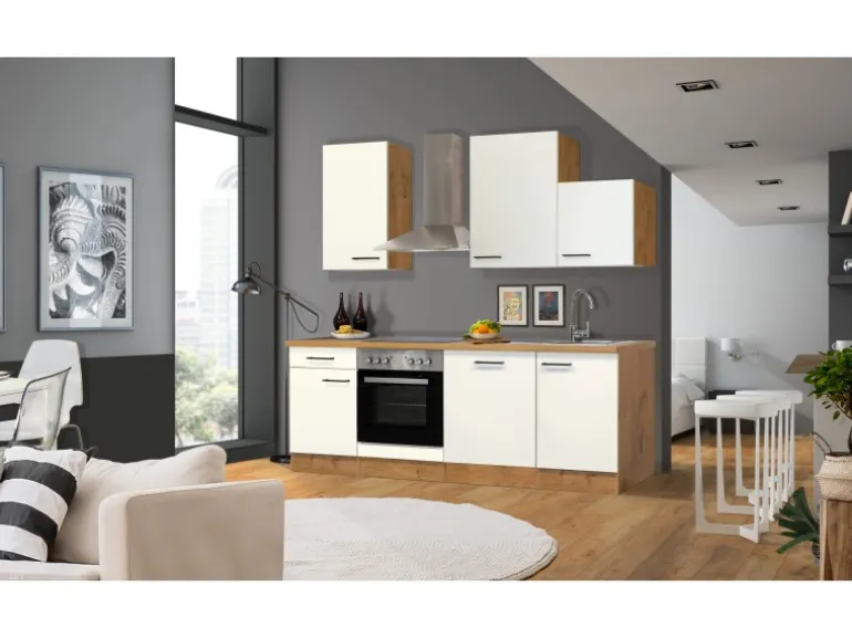 Die kleine Küche bietet dennoch in den Ober- und Unterschränken Stauraum für Geschirr, Gläser, Küchenutensilien und Geräte. Die Türen der Schränke können spiegelverkehrt aufgebaut werden, sodass sich die Küchenzeile an räumliche Gegebenheiten ausrichten lässt. Die Fronten aus pflegeleichtem Kunststoff sowie die stabile Bauweise der Schrankkörper sorgen für eine lange Lebensdauer der Küche.