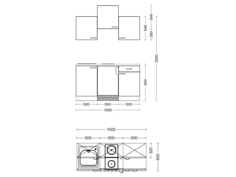Die komplette Singleküche ist bestehend aus (B x H x T):