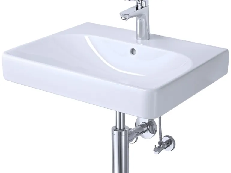 Das Waschbecken wird inklusive einem Hansgrohe Einhebelmischer mit Ablaufgarnitur geliefert. Zudem sind ein Design-Flaschensiphon und Eckventile im Lieferumfang enthalten.