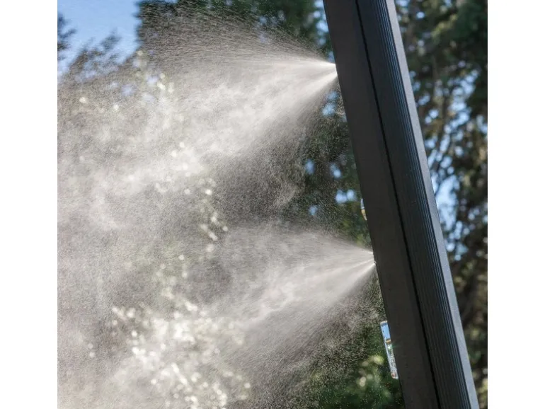 Mit einem großzügigen 38 l Wassertank, der durch Sonnenenergie erwärmt wird, bietet diese Dusche warmes Wasser ganz ohne Stromanschluss. Der verstellbare Duschkopf sorgt für ein angenehmes Duscherlebnis, während der integrierte Fußwaschhahn zusätzlichen Komfort bietet.