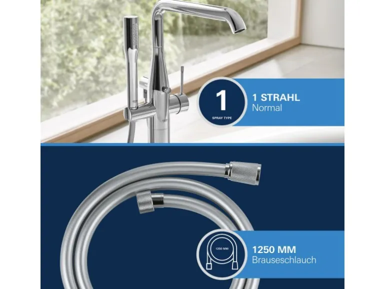 Die Grohe Einhand-Wannenbatterie Essence verbindet Eleganz mit ausgezeichneter Leistung. Diese Wannenarmatur ist der ideale Partner für Ihre freistehende Badewanne. Das zylindrische Design der Grohe Essence Serie ist mit der glänzenden Grohe StarLight Chromoberfläche versehen. Sie wird als Garnitur mit Wandbrausehalter, Grohe Euphoria Cosmopolitan Stick Handbrause (27400000) und Grohe SilverFlex 125-cm-Brauseschlauch (28362000) geliefert. Mit der in die Einhand-Armatur integrierten Grohe SilkMove Kartusche lassen sich Wassertemperatur und Volumen mühelos und präzise regeln. Der Auslauf ist bis 360 Grad schwenkbar und die SpeedClean Düsen sind äußerst pflegeleicht. Mit dem integrierten Grohe AquaGuide lässt sich der Strahlwinkel des Wannenauslaufs mühelos einstellen.