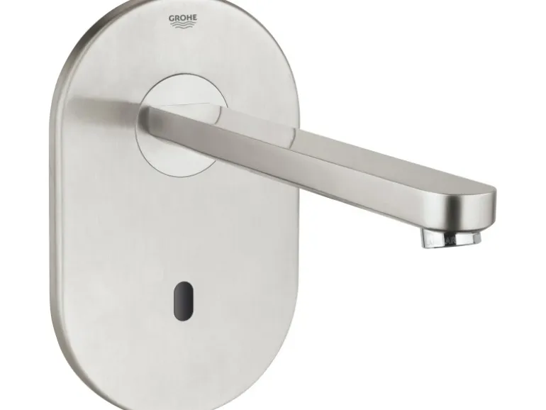 Die Grohe Infrarot-Elektronik für Ihre Waschtisch-Wandarmatur Eurosmart CE besitzt einen Infrarot-Sensor für bidirektionale Kommunikation für kaltes oder vorgemischtes Wasser. Sie besitzt einen Trafo 100-230 V AC, 50-60 Hz, 6 V DC. Die Armatur wird umrandet von einer Edelstahl-Rosette. Der hochwertige Edelstahl-Auslauf misst eine Ausladung von 23,2 cm.