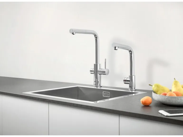 Diese Armatur verfügt über Drucktasten für drei gefilterte und gekühlte Tafelwasserarten (Still, Medium, Sprudelnd). Der Rohrauslauf ist bis zu 360° schwenkbar und herausziehbar. Die Armatur eignet sich für eine Einlochmontage.