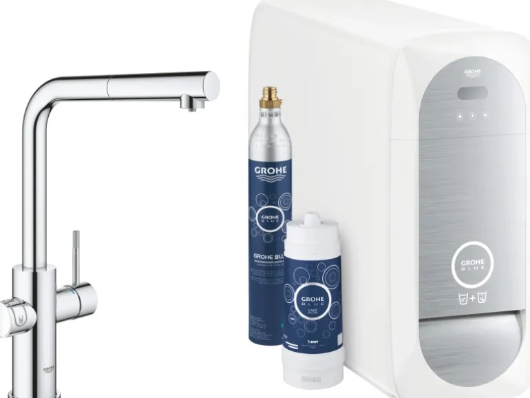 Bestehend aus Grohe Blue Home Einhand-Spültischbatterie mit Filterfunktion, Grohe Blue Home Kühler, Grohe Blue Filter S-Size und Grohe Blue 425 g CO²-Kapazität