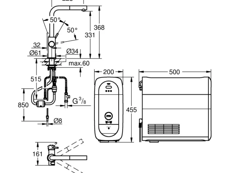 Der Kühler liefert 3 Liter sprudelndes Wasser pro Stunde. Die Kühleinheit beträgt 180 Watt, 230 V und 50 Hz. Der Blue Home Kühler benötigt eine Ventilationsöffnung im Boden des Küchenschrankes.