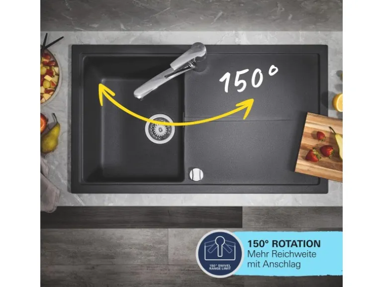 Mit einem Schwenkbereich von 150° bietet die Armatur eine hohe Flexibilität an der Spüle, ohne dabei Gefahr zu laufen, an eine Wand anzustoßen. Die Grohe SilkMove Kartusche sorgt für eine lebenslang leichtgängige und präzise Regelung des Wasserdurchflusses. Die isolierte innenliegende Wasserführung stellt sicher, dass das Trinkwasser niemals mit Blei- oder Nickel teilen in Kontakt kommt.
