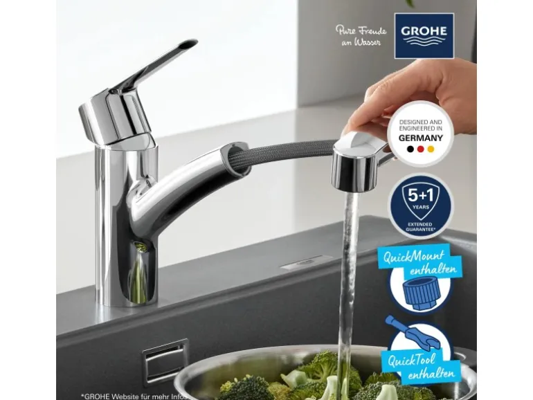 Mit der innovativen SilkMove Kartuschen-Technologie bietet die Einhebel-Spültischarmatur eine präzise Steuerung und leichtgängige Bedienung für die gesamte Lebensdauer. Dank Grohe QuickFix Plus gelingt auch die Montage schnell und einfach. Perfekt für eine schnelle Modernisierung Ihrer Küche. Für diese Spültischarmatur wird ein Wasserdruck von mindestens 1,0 bar empfohlen.