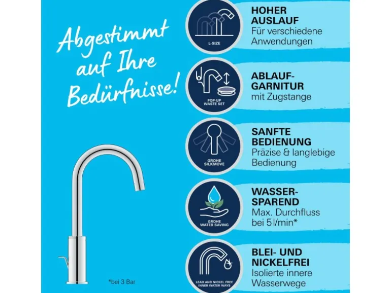 Die Waschtischarmatur in L-Size ist ein idealer Einhebelmischer und verfügt über einen hohen, schwenkbaren Rohrauslauf, der die Nutzung vereinfacht und flexibler macht. Die neue, moderne Zugstangen-Garnitur aus Metall sorgt für einen kontrollierten Wasserablauf. Der integrierte Temperaturbegrenzer schützt vor Verbrühungen.