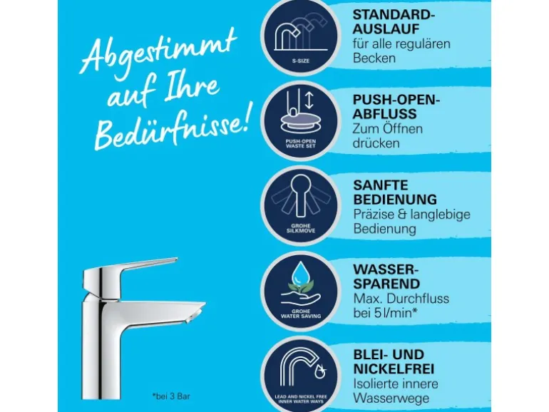 Die Grohe QuickFix Waschtischarmatur Start S-Size mit Push-open Ablaufgarnitur verfügt neben der bequemen Einlochmontage zudem über das Grohe QuickFix Installationssystem, mit dem eine einfachere und schnellere Montage gelingt- Montagewerkzeug inklusive. Die Armatur verfügt über eine variabel einstellbare Begrenzung der Wassermenge sowie über einen Temperaturbegrenzer. Grohe Zero bietet getrennte innenliegende Wasserwege und sorgt so dafür, dass innerhalb der Armatur der Kontakt zu Blei oder Nickel vermieden wird. Der Bedienungshebel ist aus Metall, der glatte Körper verfügt über eine Push-open Ablaufgarnitur. Die StarLight Oberfläche ist schmutzabweisend und kratzfest und sorgt so neben Glanz auch für dauerhafte Langlebigkeit. Flexible Anschlussschläuche bieten alle Optionen beim Einbau.