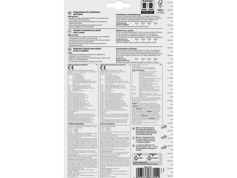Stäbchen zwischen Pflanzenstiel und Topfrand vollständig in die Blumenerde stecken. Bei größeren Töpfen gleichmäßig verteilen. Ein Topfdurchmesser von 9 cm entspricht 1 Stäbchen, 12 cm entspricht 2 Stäbchen, 15 cm entspricht 4 Stäbchen, 18 cm entspricht 5 Stäbchen. Frisch umgetopfte Pflanzen erst nach 3 Wochen düngen.