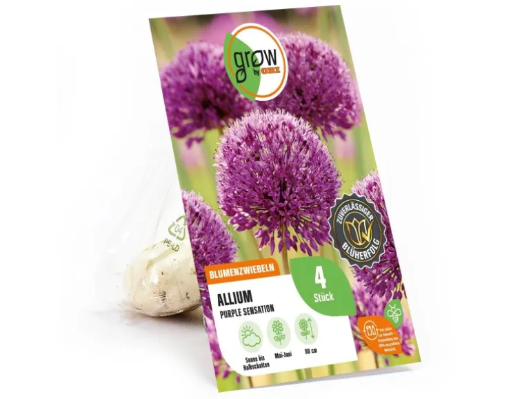 Die GROW by OBI Zierlauch Blumenzwiebel „Purple Sensation“ (Allium aflatunense) ist eine bemerkenswerte Sorte mit intensiv violetten, kugelförmigen Blütenköpfen. Diese Sorte zeichnet sich durch ihre robuste Natur und ihre auffällige Präsenz aus. Allium Purple Sensation ist ein Blickfang in deinem Garten, besonders wenn er in Gruppen gepflanzt wird. Er ist nicht nur eine Bereicherung für das Auge, sondern auch eine beliebte Anziehungspunkt für bestäubende Insekten wie Bienen und Schmetterlinge.