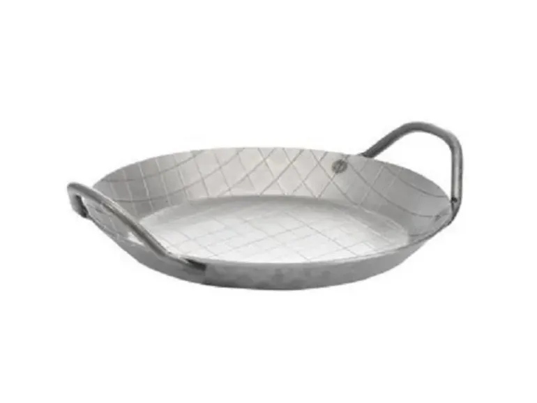 GSW Eisenpfanne mit Seitengriffen, ø 28 cmBeschreibungServierpfanne aus beidseitig rautengeschmiedetem EisenExtraschwere 2,5 mm starke Gastro-QualitätMit 2 angeschweißten SeitengriffenFür Gas-, Elektro-, Ceran- und Induktionsherde sowie für den Backofen geeignetMaterialstärke: ca. 2,5 mmBodenstärke: ca. 2,5 mmIdeal zum Braten und ServierenDie Servierpfanne ist ideal geeignet für KrossgebratenesGeeignet zur Nutzung auf offenem FeuerHervorragend für die Verwendung auf Gasherden geeignetMaßeDurchmesser 28 cmHöhe 3,8 cm / Inhalt 1,5 Ltr.FarbeSilberHinweiseNicht spülmaschinengeeignet