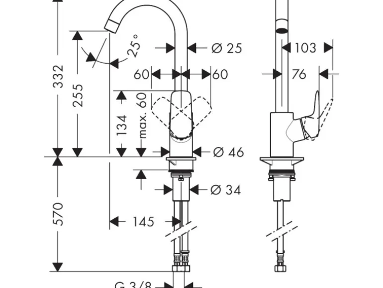 Beweglicher Auslauf mit einem Schwenkbereich von 110°/150° und 360°