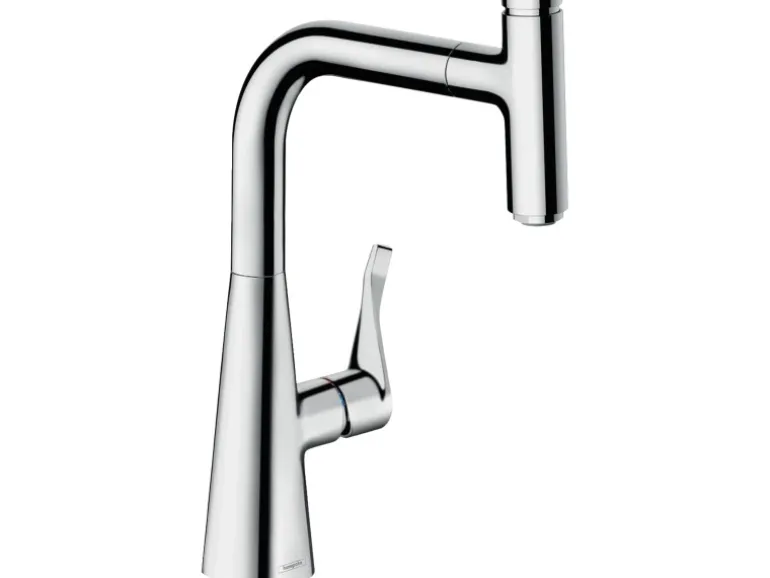 Hände voll? Für den Hansgrohe Metris Select Küchenmischer kein Problem. Starten und Stoppen Sie den Wasserfluss ganz einfach durch Drücken des Select-Knopfs. Das ist auch einfach mit dem Ellenbogen oder Handrücken möglich. Durch den Ausziehauslauf gelingt auch das Befüllen von Töpfen in geringer Entfernung ohne Probleme. Die MagFit Brausehalterung sorgt zusätzlich für eine einfache und nahezu geräuschlose Rückführung des Schlauchs. Der Auslauf fixiert sich wieder mittig im Küchenmischerauslauf.