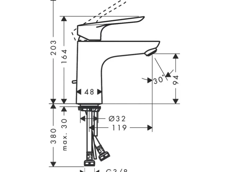 Einfach eingebaut: Die Armatur wird über flexible Anschlussschläuche (G 3/8) mit den vorhandenen Wasseranschlüssen verbunden (Anschlussgröße: DN15)