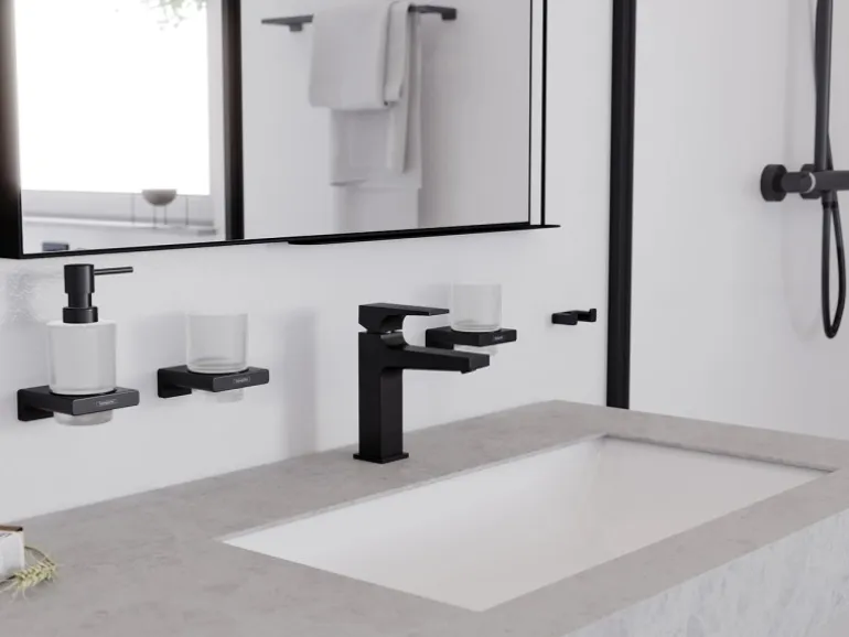 Ausdrucksstarker Kontrast oder perfekte Ergänzung: geometrische Waschtischarmatur in der Oberfläche Matt-Schwarz. Der Einhebel-Waschtischmischer Metropol 110 mit Hebelgriff und Push-Open-Ablaufgarnitur in der Oberfläche Matt Black von hansgrohe beeindruckt durch sein geometrisches Design mit klarer Formensprache. Die elegante, flächige Armatur erhält durch die Trendfarbe Matt-Schwarz zusätzliche Ausdruckskraft. So kann der Waschtischmischer als gezielter Kontrast oder perfekte Ergänzung eingesetzt werden, vor allem in einem modernen Badambiente. Zusätzliches Plus: Der große Abstand zwischen Auslauf und Waschbecken bietet mehr Raum und eine komfortable Nutzung (ComfortZone 110). Für beispielsweise angenehmes und bequemes Händewaschen. Großer Bedienkomfort, vielseitiger Einsatz. Über den flächigen Hebelgriff der Armatur lassen sich Wassermenge und Temperatur schnell und einfach einstellen. Das leichtgängige Keramikmischsystem gewährleistet langanhaltende zuverlässige Funktionalität. Einfach zu reinigen: Kalk lässt sich mühelos durch leichtes Abwischen über den Silikoneinsatz am Auslauf entfernen (QuickClean). Spürbar fülligere, weichere Tropfen: Das Wasser wird automatisch mit Luft angereichert (AirPower). Die Durchflussmenge wird automatisch auf maximal 5 l/min begrenzt, unabhängig vom Wasserdruck. Einfache Installation: Die Armatur kann an die vorhandenen Wasseranschlüsse angeschlossen werden. Anschlussart: G 3/8-Anschlussschläuche. Push-Open-Ablaufgarnitur mit einfach zu bedienendem Druckstopfen: Der Hebel an der Rückseite entfällt für ein puristisches Armaturendesign. Für Durchlauferhitzer geeignet und daher vielseitig einsetzbar.