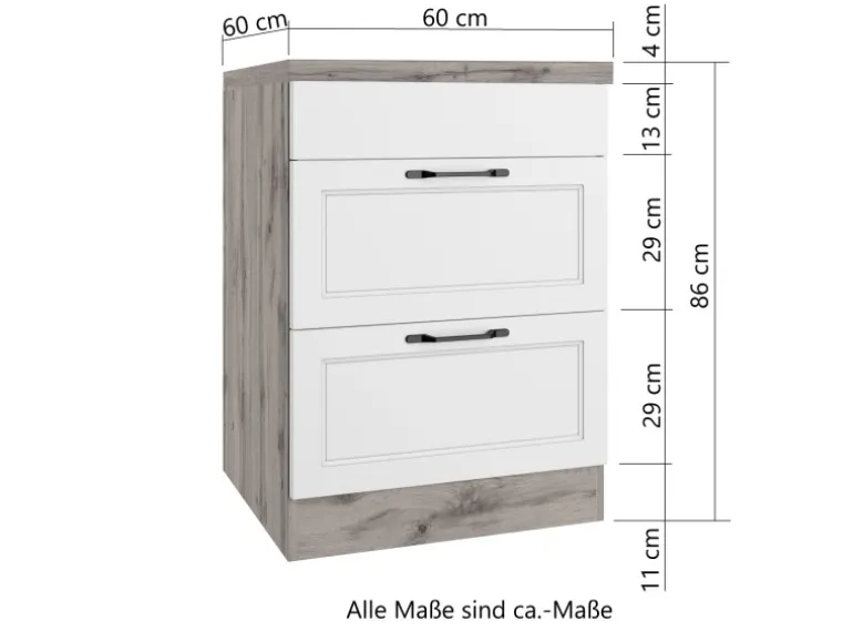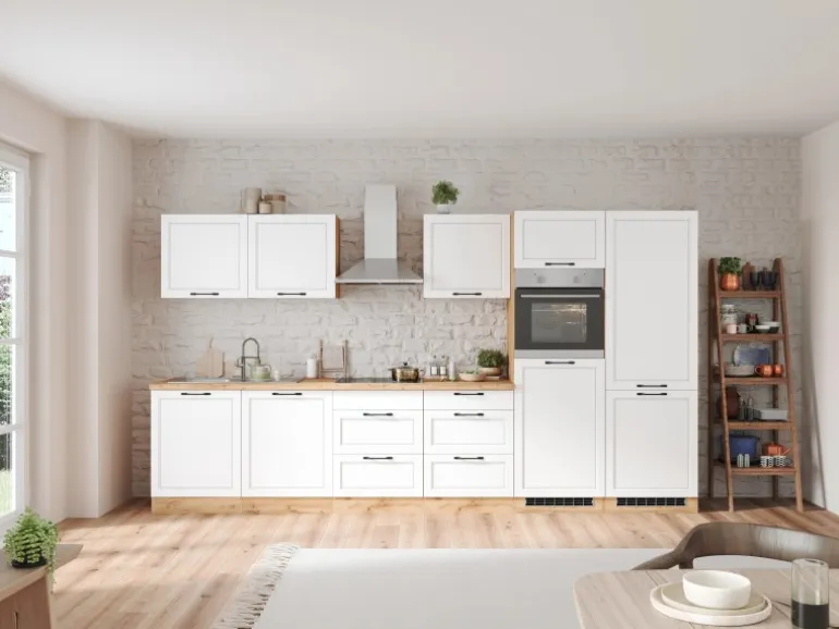 Die Küchenzeile wird Ihnen zerlegt und ohne Dekoration bis Bordsteinkante geliefert. Die Anordnung der Küchenelemente und die Anschläge der Türen sind somit für Sie frei wählbar. Die Arbeitsplatte wird ohne Ausschnitte geliefert. Technische Änderungen und Irrtümer vorbehalten