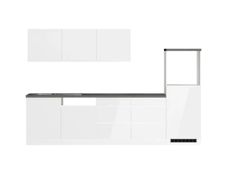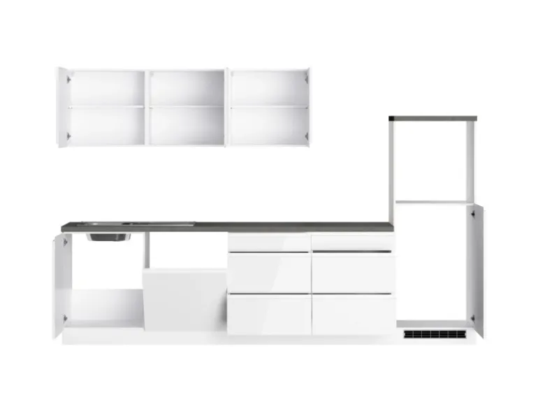 Die Küchenzeile wird Ihnen zerlegt und ohne Dekoration bis Bordsteinkante geliefert. Die Anordnung der Küchenelemente und die Anschläge der Türen sind somit für Sie frei wählbar. Die Arbeitsplatte wird ohne Ausschnitte geliefert. Technische Änderungen und Irrtümer vorbehalten