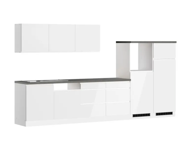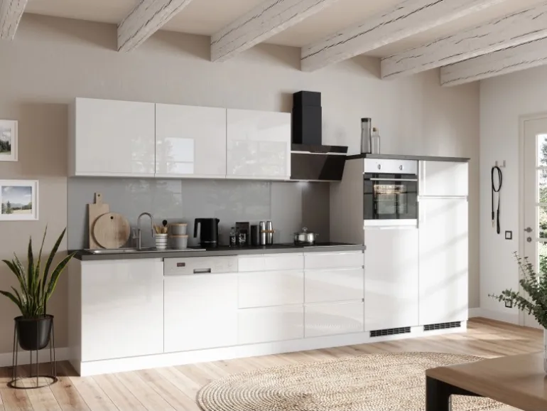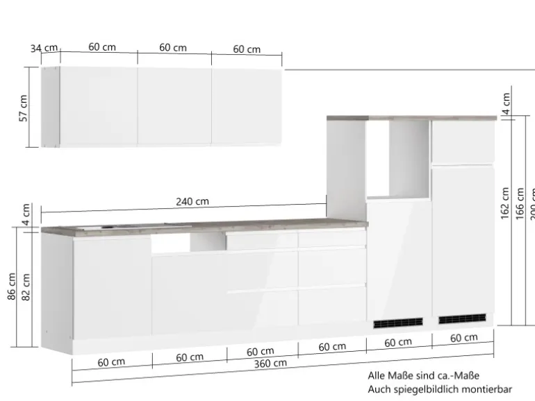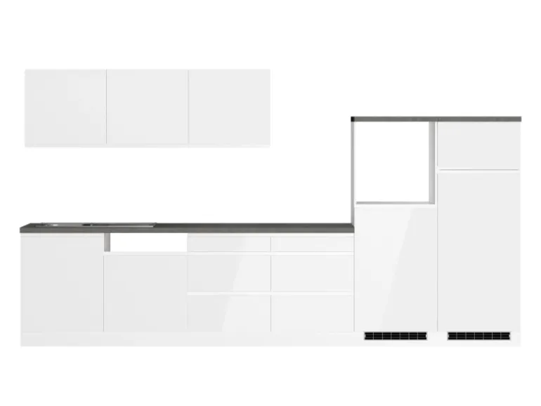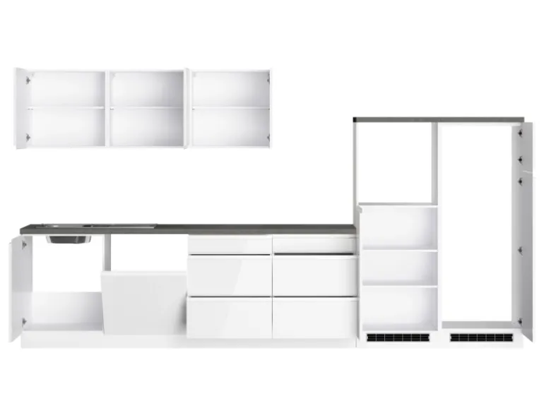 Die Küchenzeile wird Ihnen zerlegt und ohne Dekoration bis Bordsteinkante geliefert. Die Anordnung der Küchenelemente und die Anschläge der Türen sind somit für Sie frei wählbar. Die Arbeitsplatte wird ohne Ausschnitte geliefert. Technische Änderungen und Irrtümer vorbehalten