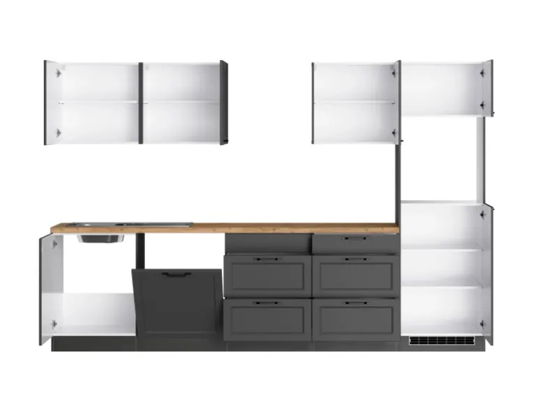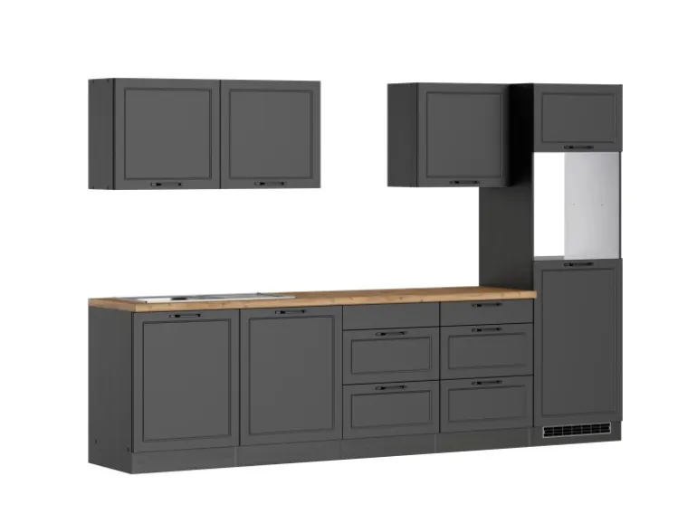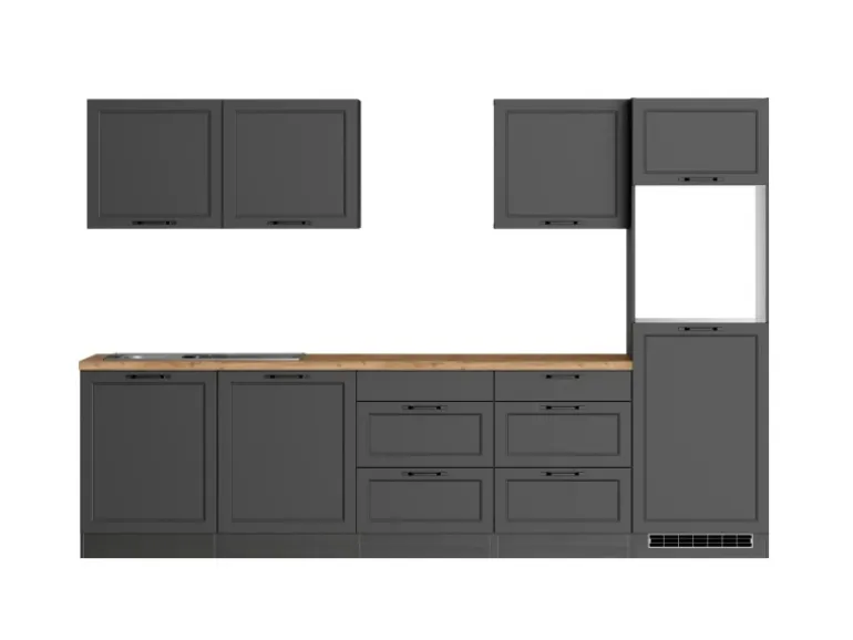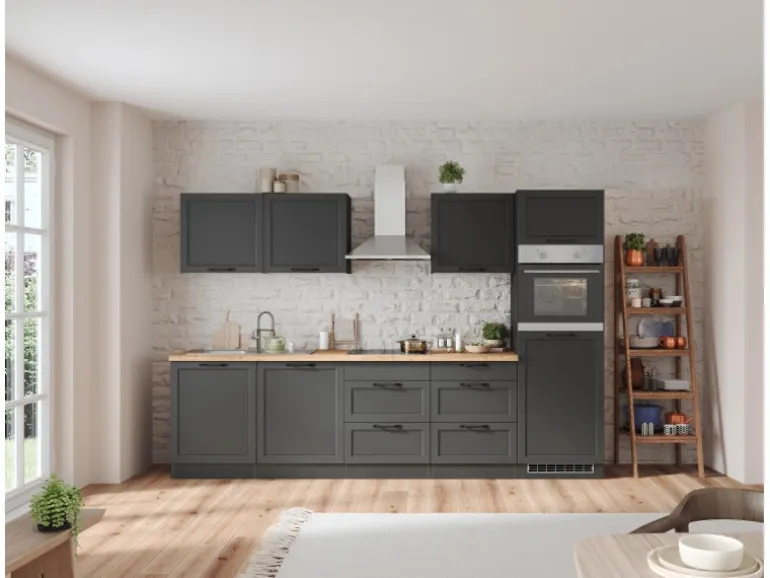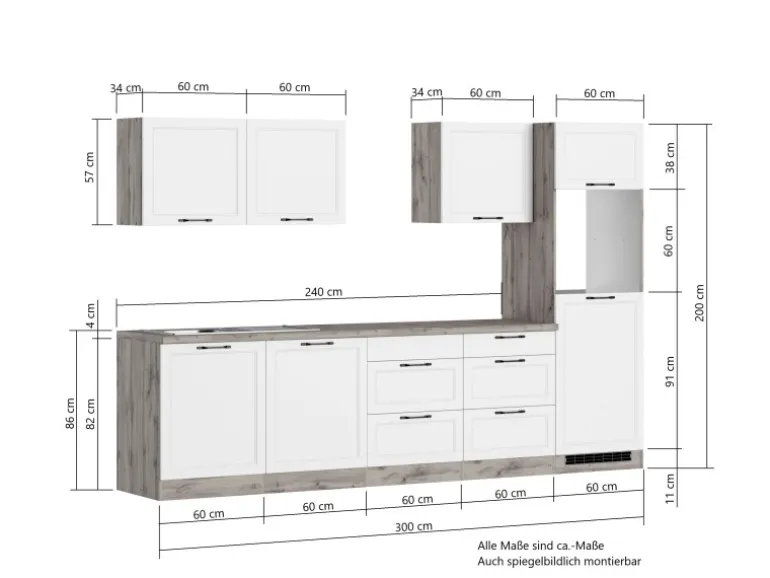 Die Küchenzeile wird Ihnen zerlegt und ohne Dekoration bis Bordsteinkante geliefert. Die Anordnung der Küchenelemente und die Anschläge der Türen sind somit für Sie frei wählbar. Die Arbeitsplatte wird ohne Ausschnitte geliefert. Technische Änderungen und Irrtümer vorbehalten