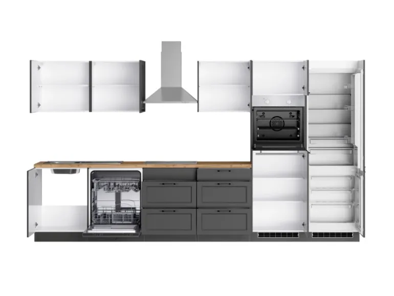 Die Küchenzeile wird Ihnen zerlegt und ohne Dekoration bis Bordsteinkante geliefert. Die Anordnung der Küchenelemente und die Anschläge der Türen sind somit für Sie frei wählbar. Die Arbeitsplatte wird ohne Ausschnitte geliefert. Technische Änderungen und Irrtümer vorbehalten