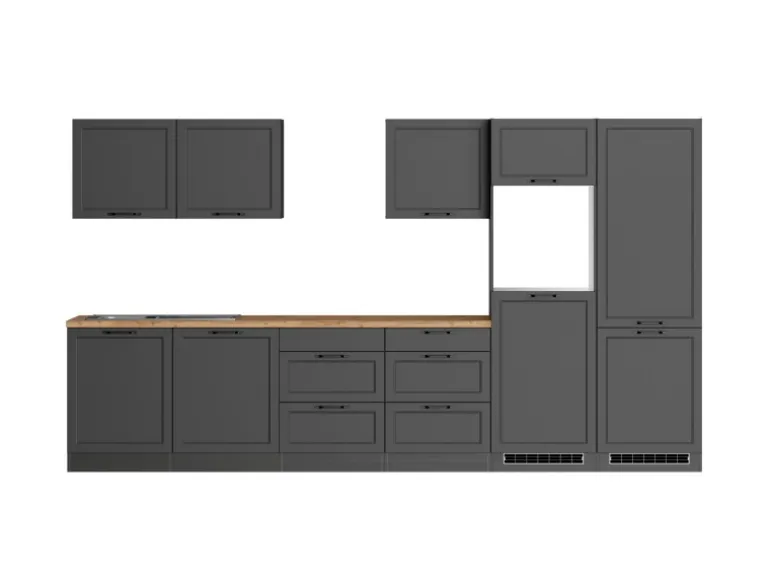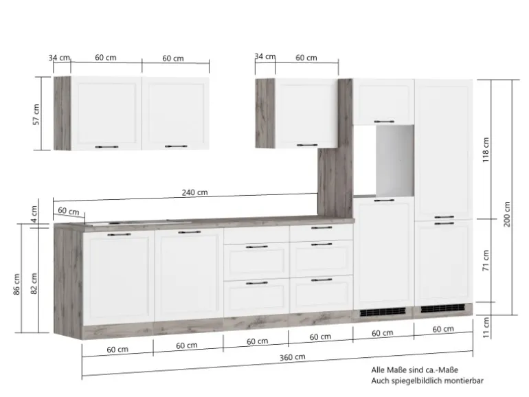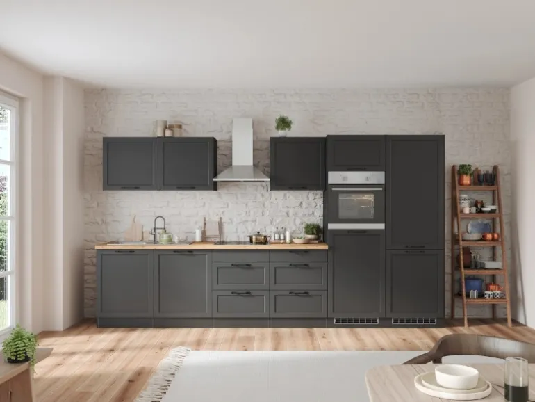 Die Küchenzeile wird Ihnen zerlegt und ohne Dekoration bis Bordsteinkante geliefert. Die Anordnung der Küchenelemente und die Anschläge der Türen sind somit für Sie frei wählbar. Die Arbeitsplatte wird ohne Ausschnitte geliefert. Technische Änderungen und Irrtümer vorbehalten