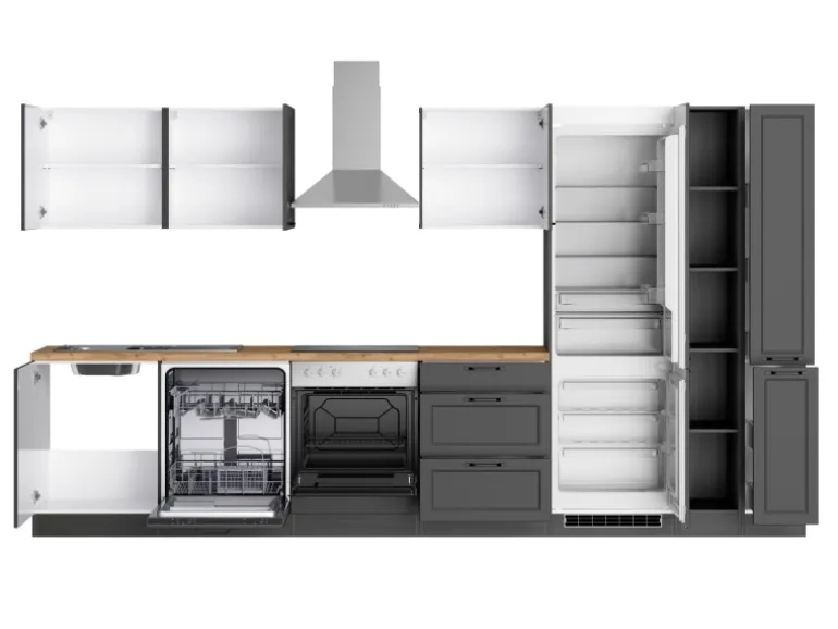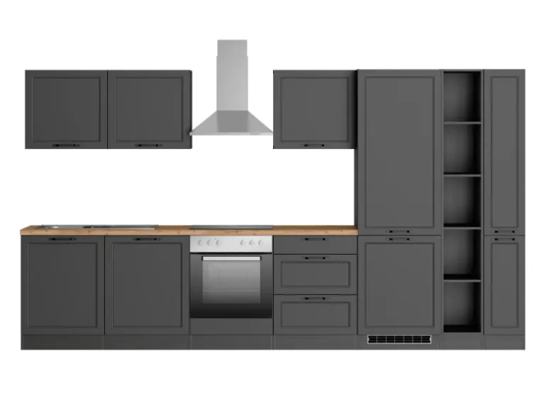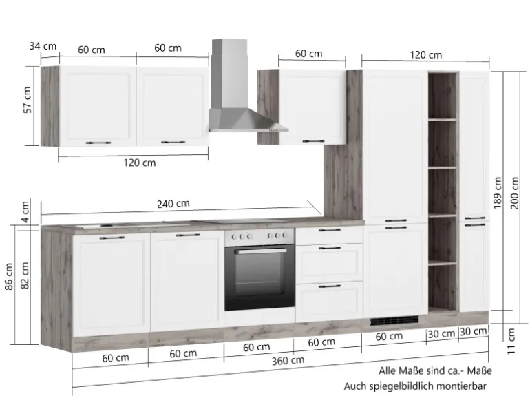 Die Küchenzeile wird Ihnen zerlegt und ohne Dekoration bis Bordsteinkante geliefert. Die Anordnung der Küchenelemente und die Anschläge der Türen sind somit für Sie frei wählbar. Die Arbeitsplatte wird ohne Ausschnitte geliefert. Technische Änderungen und Irrtümer vorbehalten