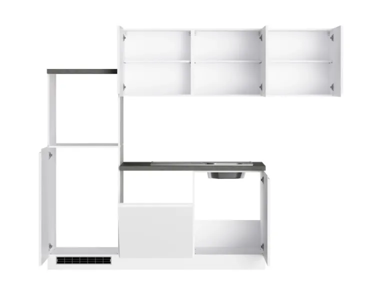 Die Küchenzeile wird Ihnen zerlegt und ohne Dekoration bis Bordsteinkante geliefert. Die Anordnung der Küchenelemente und die Anschläge der Türen sind somit für Sie frei wählbar. Die Arbeitsplatte wird ohne Ausschnitte geliefert. Technische Änderungen und Irrtümer vorbehalten