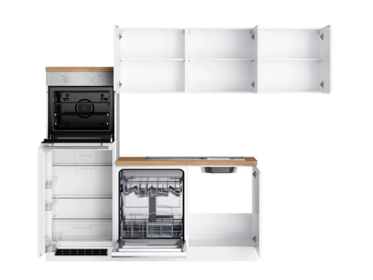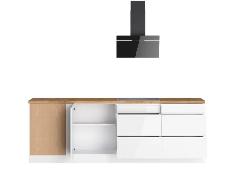 Die Küchenzeile wird Ihnen zerlegt und ohne Dekoration bis Bordsteinkante geliefert. Die Anordnung der Küchenelemente und die Anschläge der Türen sind somit für Sie frei wählbar. Die Arbeitsplatte wird ohne Ausschnitte geliefert. Technische Änderungen und Irrtümer vorbehalten