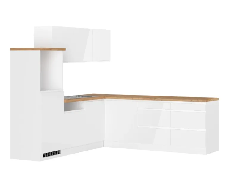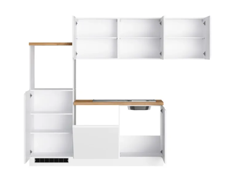Die Küchenzeile wird Ihnen zerlegt und ohne Dekoration bis Bordsteinkante geliefert. Die Anordnung der Küchenelemente und die Anschläge der Türen sind somit für Sie frei wählbar. Die Arbeitsplatte wird ohne Ausschnitte geliefert. Technische Änderungen und Irrtümer vorbehalten