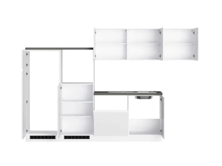 Die Küchenzeile wird Ihnen zerlegt und ohne Dekoration bis Bordsteinkante geliefert. Die Anordnung der Küchenelemente und die Anschläge der Türen sind somit für Sie frei wählbar. Die Arbeitsplatte wird ohne Ausschnitte geliefert. Technische Änderungen und Irrtümer vorbehalten