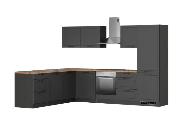 Die Küchenzeile wird Ihnen zerlegt und ohne Dekoration bis Bordsteinkante geliefert. Die Anordnung der Küchenelemente und die Anschläge der Türen sind somit für Sie frei wählbar. Die Arbeitsplatte wird ohne Ausschnitte geliefert. Technische Änderungen und Irrtümer vorbehalten