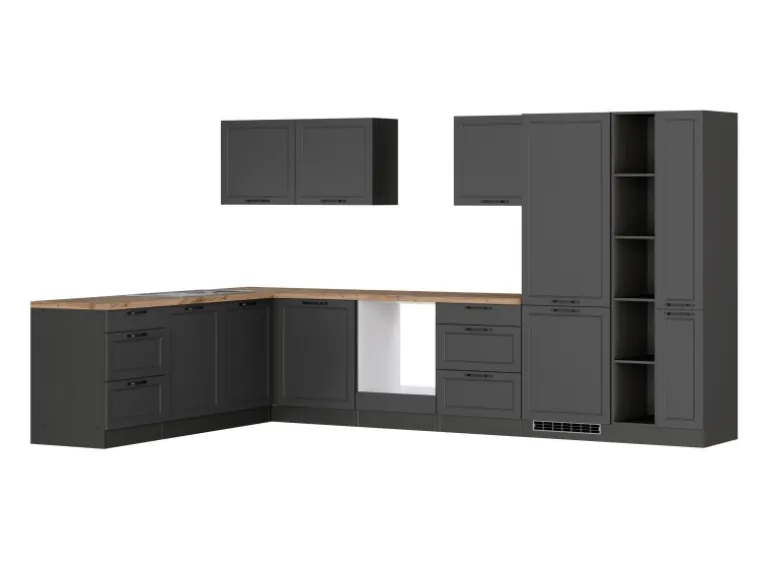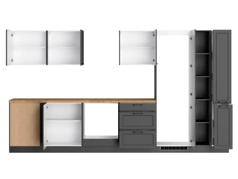 Die Küchenzeile wird Ihnen zerlegt und ohne Dekoration bis Bordsteinkante geliefert. Die Anordnung der Küchenelemente und die Anschläge der Türen sind somit für Sie frei wählbar. Die Arbeitsplatte wird ohne Ausschnitte geliefert. Technische Änderungen und Irrtümer vorbehalten