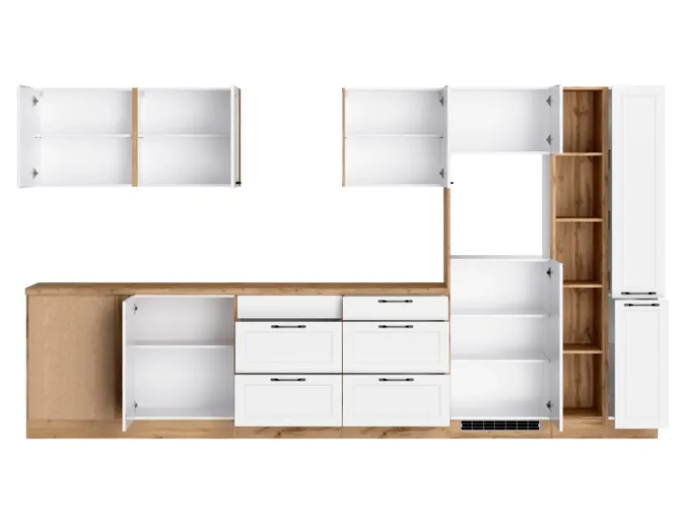 Die Küchenzeile wird Ihnen zerlegt und ohne Dekoration bis Bordsteinkante geliefert. Die Anordnung der Küchenelemente und die Anschläge der Türen sind somit für Sie frei wählbar. Die Arbeitsplatte wird ohne Ausschnitte geliefert. Technische Änderungen und Irrtümer vorbehalten