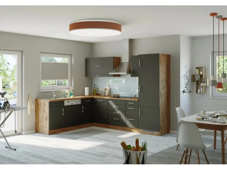 Die Küchenserie Sorrento besticht durch ihre 4 absolut trendstarken Dekorkombinationen, in denen immer das ausdrucksstarke Eichedekor eine entscheidende Rolle spielt. Durch eine Vielzahl an Zeilen- und Winkelkombinationen, die außerdem durch eine große Auswahl an Ergänzungsmöbeln komplettiert werden, ergibt sich ein breites Spektrum an Einrichtungsmöglichkeiten. Möchten Sie Ihren Backofen lieber autark in einem Hochschrank untergebracht haben? Benötigen Sie einen großzügigen Kühlschrank mit integriertem Gefrierschrank? Lagern Sie Ihre Vorräte gern in Auszügen und Apothekerschränken? Alle Schränke sind flexibel aufzustellen und die Türen sind wahlweise rechts oder links montierbar. Entscheiden Sie selbst- hier bleiben keine Wünsche offen.