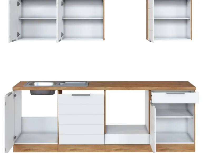 Die Küchenzeile wird Ihnen zerlegt und ohne Dekoration bis Bordsteinkante geliefert. Die Anordnung der Küchenelemente und die Anschläge der Türen sind somit für Sie frei wählbar. Die Arbeitsplatte wird ohne Ausschnitte geliefert. Technische Änderungen und Irrtümer vorbehalten