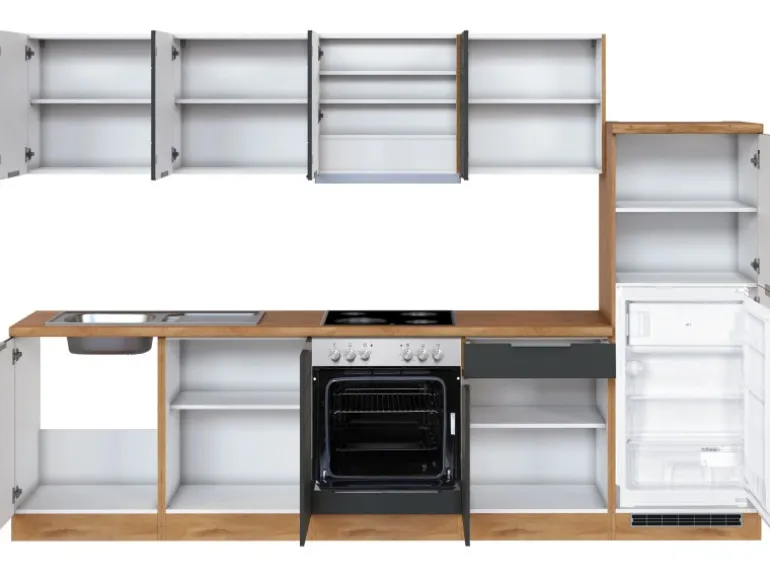 Die Küchenzeile wird Ihnen zerlegt und ohne Dekoration bis Bordsteinkante geliefert. Die Anordnung der Küchenelemente und die Anschläge der Türen sind somit für Sie frei wählbar. Die Arbeitsplatte wird ohne Ausschnitte geliefert. Technische Änderungen und Irrtümer vorbehalten