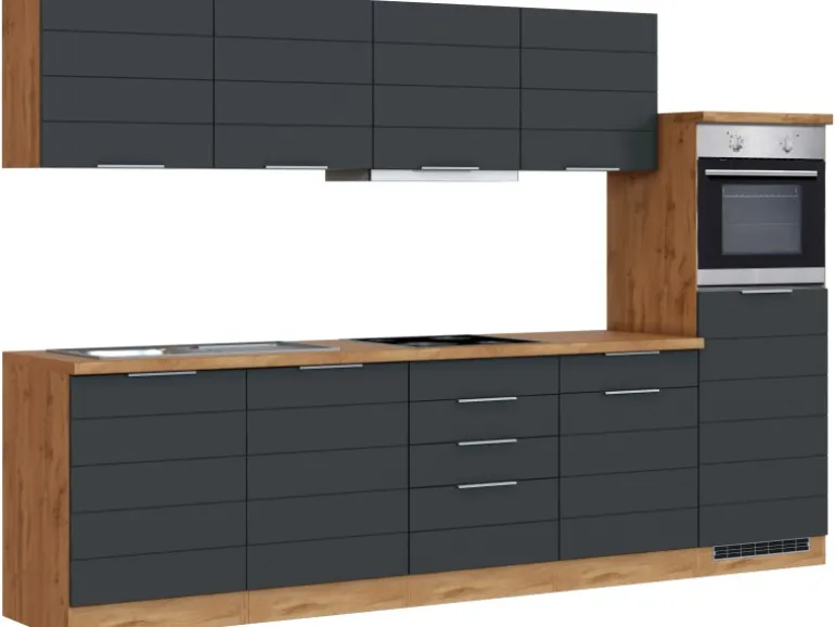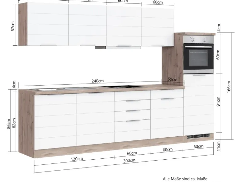Die Küchenzeile wird Ihnen zerlegt und ohne Dekoration bis Bordsteinkante geliefert. Die Anordnung der Küchenelemente und die Anschläge der Türen sind somit für Sie frei wählbar. Die Arbeitsplatte wird ohne Ausschnitte geliefert. Technische Änderungen und Irrtümer vorbehalten
