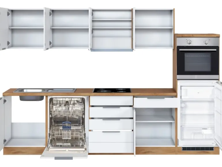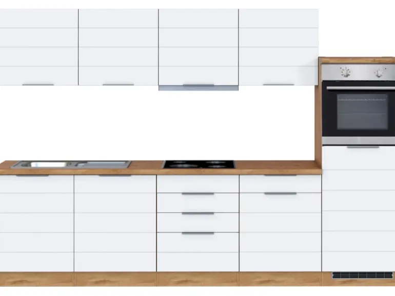 Die Küchenzeile wird Ihnen zerlegt und ohne Dekoration bis Bordsteinkante geliefert. Die Anordnung der Küchenelemente und die Anschläge der Türen sind somit für Sie frei wählbar. Die Arbeitsplatte wird ohne Ausschnitte geliefert. Technische Änderungen und Irrtümer vorbehalten