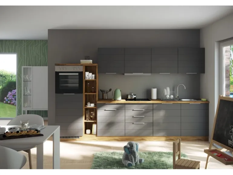 Die Küchenzeile wird Ihnen zerlegt und ohne Dekoration bis Bordsteinkante geliefert. Die Anordnung der Küchenelemente und die Anschläge der Türen sind somit für Sie frei wählbar. Die Arbeitsplatte wird ohne Ausschnitte geliefert. Technische Änderungen und Irrtümer vorbehalten