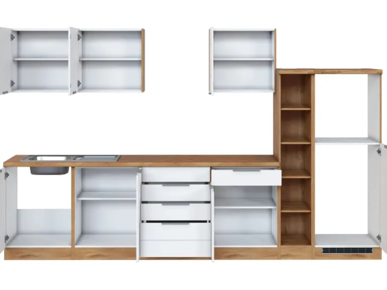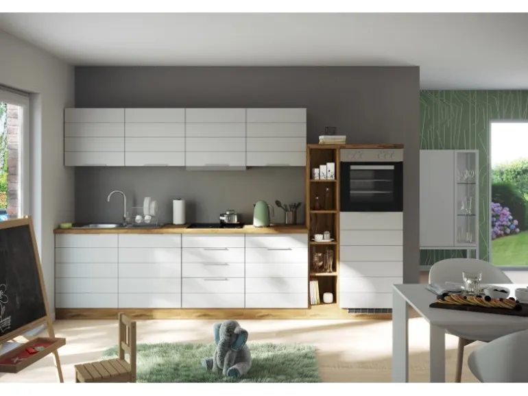 Die Küchenserie FLORENZ besticht durch ihre 2 absolut trendstarken Dekorkombinationen, in denen immer das ausdrucksstarke Wotan-Eichedekor eine entscheidende Rolle spielt. Elegante Metall-Griffleisten an hochwertigen MDF-Fronten mit Lisene in Mattweiß und Mattgrau werden mit einem ausdrucksstarken Eichedekor beim Korpus und der Arbeitsplatte kombiniert. So entsteht eine herausragende Optik, die genau den aktuellen Trend widerspiegelt. Eine Vielzahl an vordefinierten Zeilen und Winkel und verschiedenste Ergänzungsmöbel lassen keine Wünsche offen. In den Auszügen und hinter den Türen wird reichlich Stauraum für Küchenutensilien, Kochgeschirr und mehr geboten. Als Montagehilfe sind die einzelnen Schränke mit höhenverstellbaren Ausgleichsfüßen ausgestattet. Bestimmt werden Sie hier Ihre perfekte Küche finden!